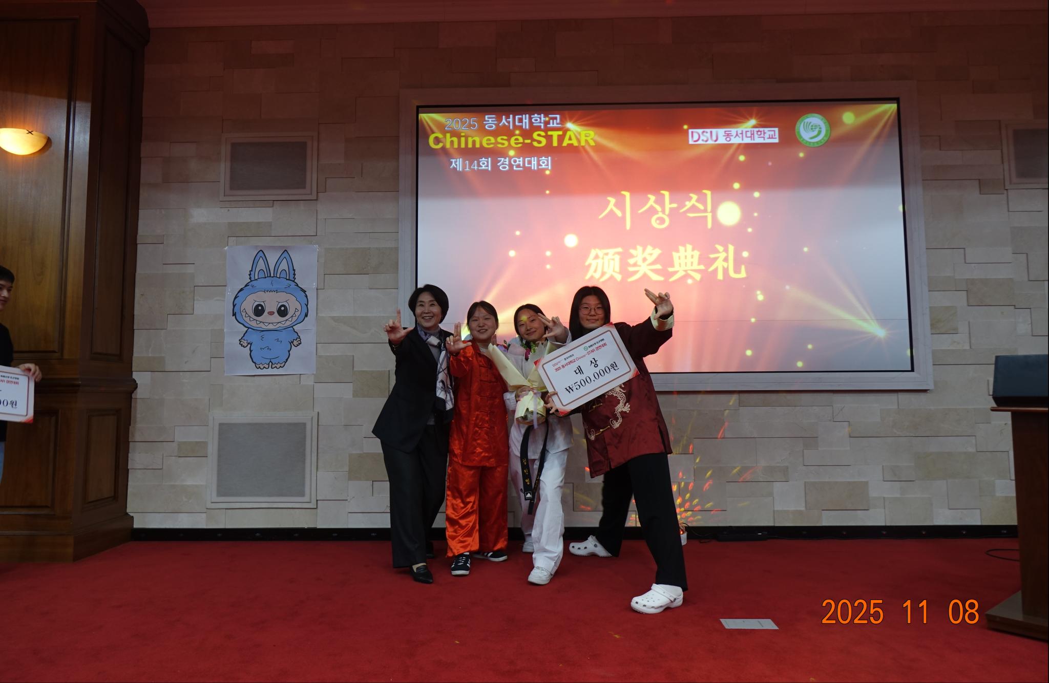 历经初赛遴选,来自京畿道、全罗南道、庆尚南道等多地高中的13组优秀选手脱颖而出晋级决赛。赛事特设“中国文化常识抢答”“贴拉布布鼻子”等互动环节,让选手们在竞技之余以歌会友、以文结缘。赛前,中国留学生带来的精彩开场表演点燃全场气氛;决赛中,选手们盛装亮相,以悠扬歌声搭配灵动舞姿,献上了一场兼具青春活力与文化韵味的视听盛宴。最终,釜山耕慧女子高中“跆拳道和功夫的合作”组合凭借标准流畅的中文发音、感染力十足的嗓音,搭配利落洒脱的跆拳道与功夫动作,以从容大方的舞台表现斩获评委们的高分认可,摘得大奖。