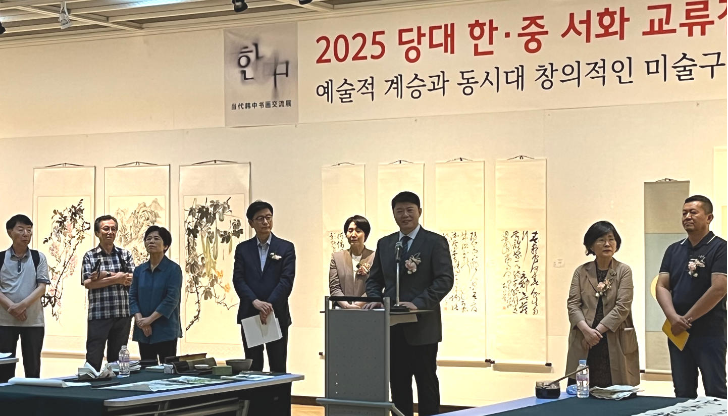 开幕式前,邢小震、董梅教授与韩国书画家现场创作交流,借韩国国乐大笒伴奏,展现中韩书画同源异彩的魅力。郑妵妍致欢迎词,感谢中韩艺术家支持,欢迎中国艺术家到访。于瓅斐、金静鲜、崔漳洛、邢小震等先后致辞,均肯定展览对中韩文化交流、艺术互鉴及友谊增进的积极意义,邢小震还表达了两校深化合作的意愿。