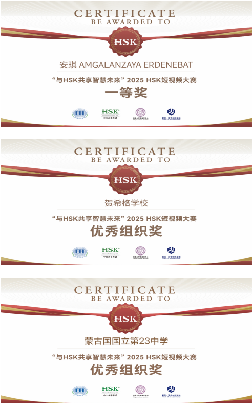 近日,由汉考国际联合清华大学东南亚中心、复旦大学汉考国际中文教育测试创新研究基地、国内外院校和中小学及HSK考点等单位共同组织的“与HSK共享智慧未来”HSK短视频大赛奖项结果公布。蒙古国立大学孔子学院下设孔子课堂国立第23中学和下设教学点贺希格中学荣获优秀组织奖。贺希格中学学生安琪凭借作品《中文学习故事》,从全球114个国家和地区提交的超过1600份参赛作品中脱颖而出,荣获大赛一等奖。