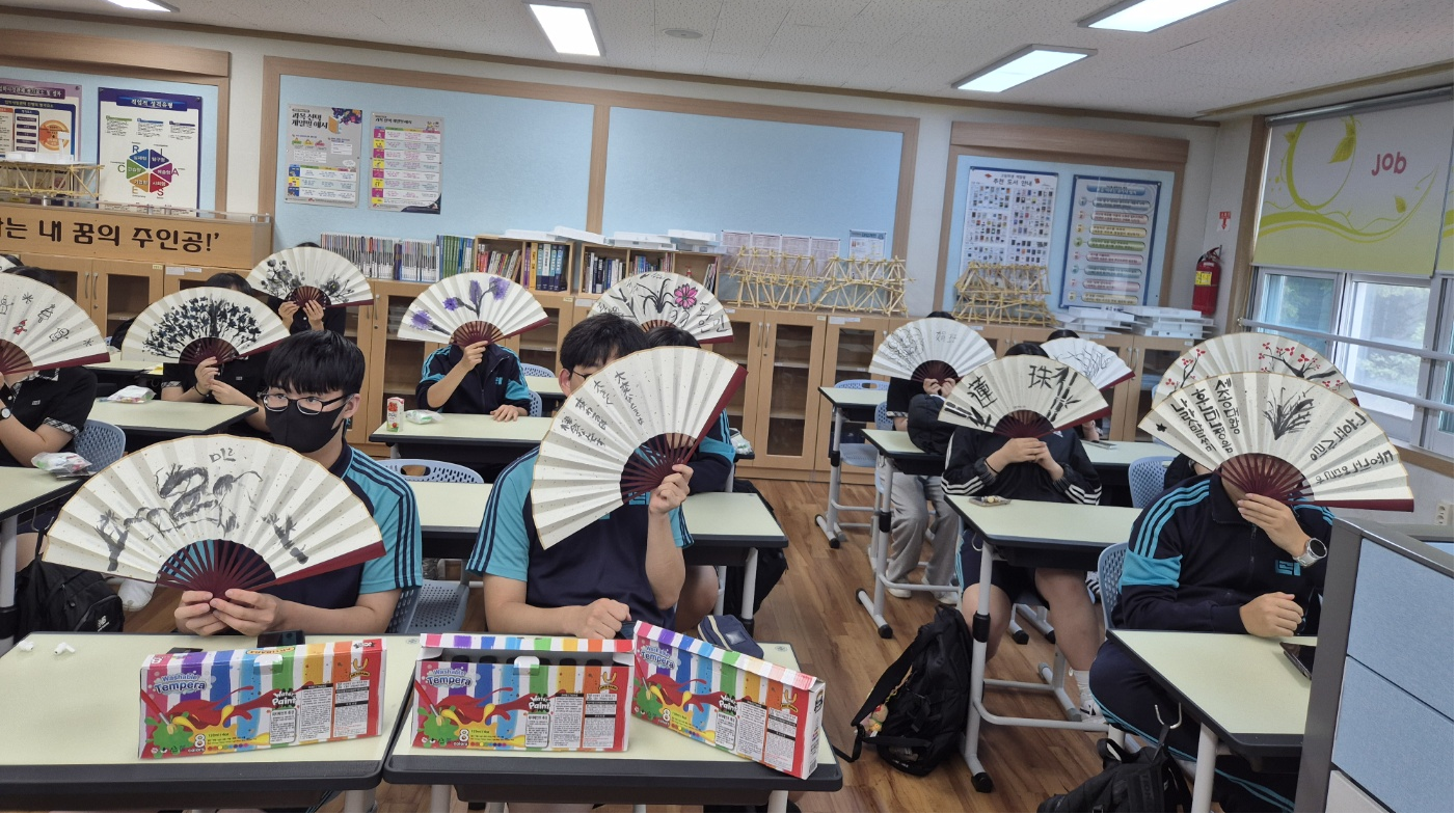 2025年9月,韩国东西大学孔子学院先后赴釜山洛东高中和釜山观光高中,为学习中文的学生讲授中国书法与折扇”文化体验课,举办“吹墨画创作+京剧头饰制作”主题文化活动,让学生沉浸式感受中国传统文化的魅力。