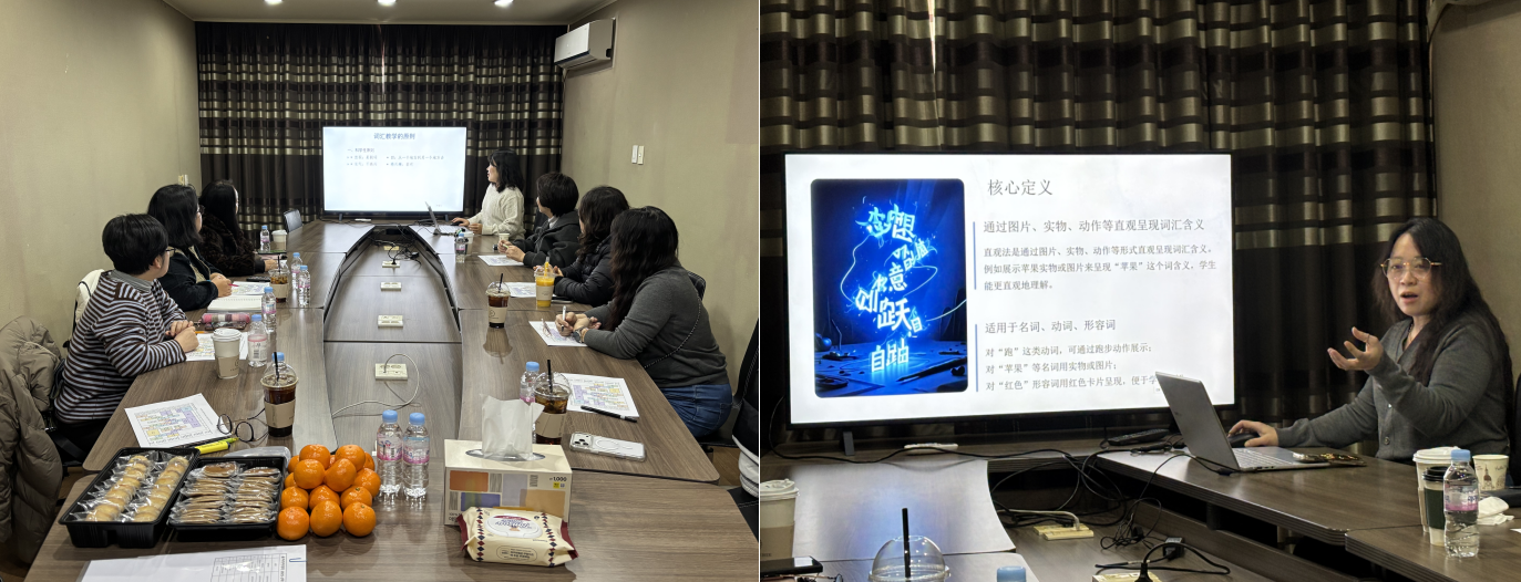 研学过程中,教师们立足不同教学对象与课堂情境,就词汇教学中的输入方式、意义建构与运用巩固等关键问题进行了深入探讨。多位教师结合自身教学经验,分享了图片法、翻译法、语言说明法、情境创设法等常用教学策略,并通过具体课堂案例,分析了不同教学方法在初级与中级学习者中的适用性与实施效果。